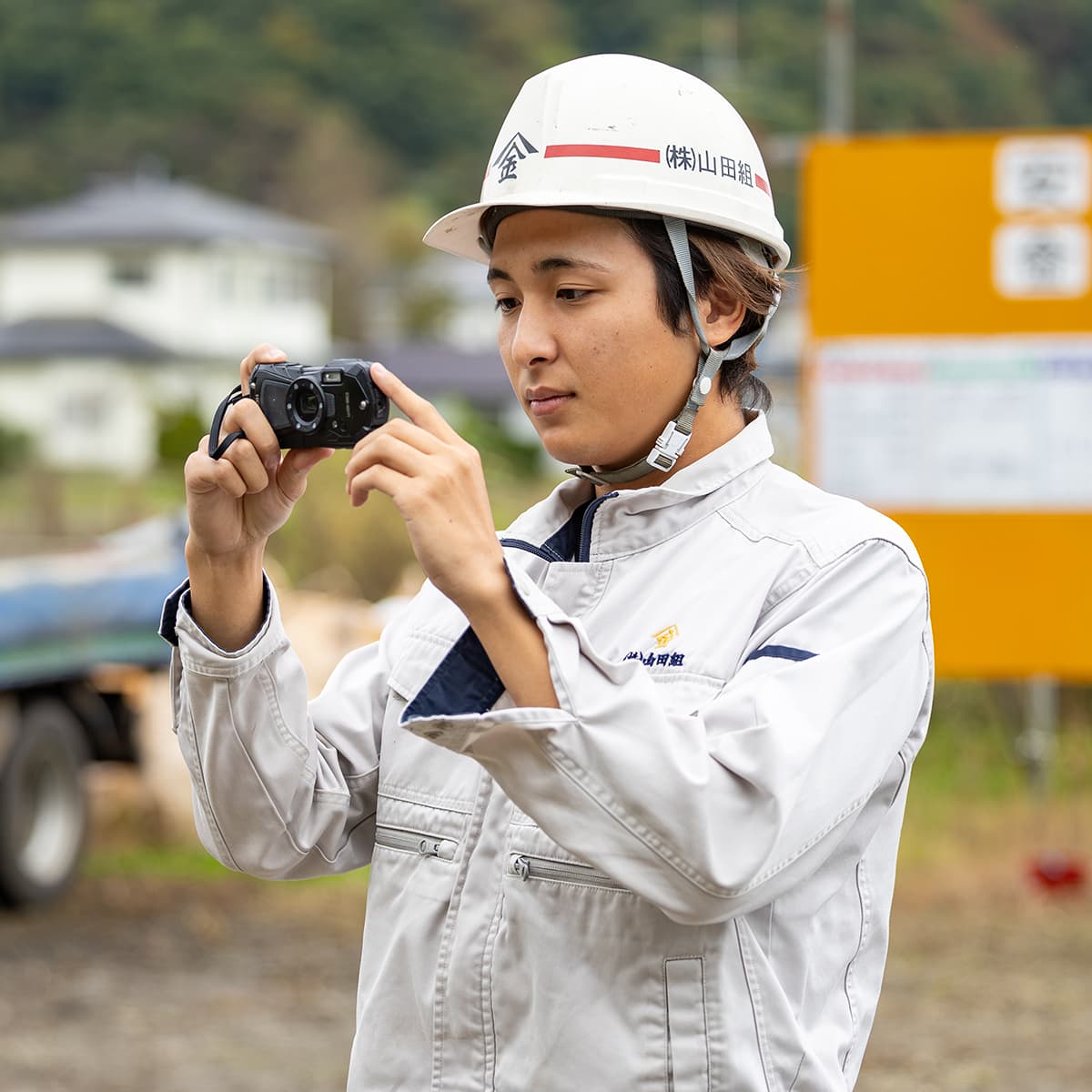 先輩社員とともに現場監督の補佐業務を担当。工事写真の撮影や書類づくりなど、現場運営の基礎を一つひとつ身につけています。現在は資格取得の勉強にも励んでおり、「思っていたよりも難しい」ですが前向きに挑戦しています。写真の精度や書類の正確さが求められる仕事に、責任とやりがいを感じています。
